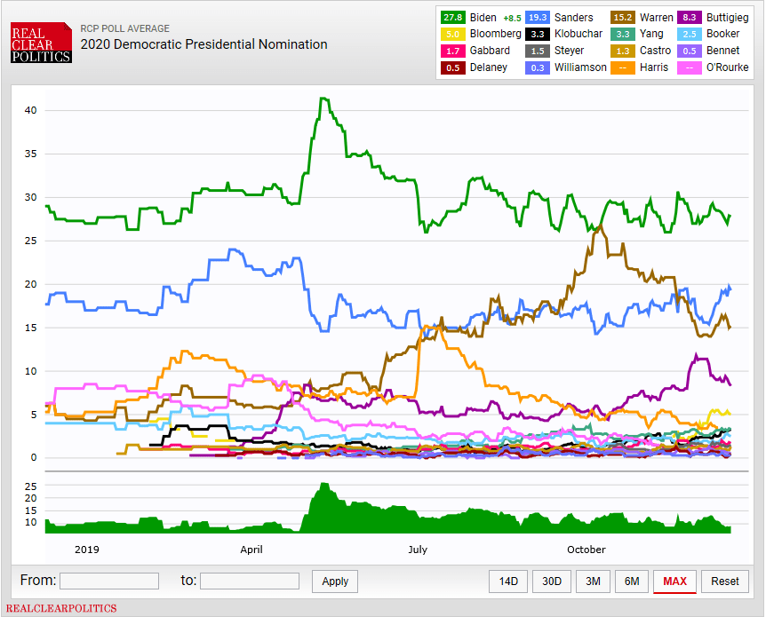 Joe Biden er blitt 77 år gammel, og har utvilsomt alderen mot seg. Men den tidligere visepresidenten har svært god standing blant amerikanerne, og i hele år har han ( ifølge meningsmålinger) vært storfavoritt til å vinne demokratenes nominasjonskamp. Nedenfor er en graf fra Real Clear Politics som viser hvordan oppslutningen av de ulike kandidatene har variert gjennom året (merk: prosentverdiene i figuren er gjennomsnittsverdier av de mange meningsmålingene som finnes der ute). Joe Biden representerer den grønne kurven øverst, og i skrivende stund har han en oppslutning på 27.8 %. Dette er 8.5 % mer enn nr 2 på listen, Bernie Sanders.