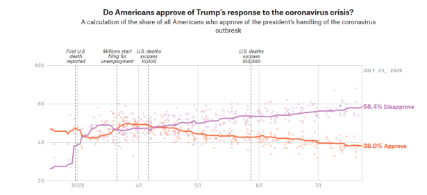 Ifølge amerikanerne har ikke President Trump klart å håndtere koronakrisen. Oversikten nedenfor fra FiveThirtyEight forteller at oppslutningen rundt Trump’s lederskap knyttet til Covid-19 har falt over tid, og er nå nede i 38 %.