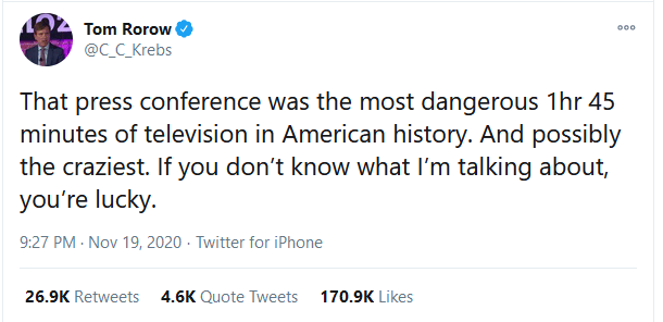 Helt til slutt: I går gjennomførte President Trump sin personlige advokat Rudy Giuliani nok en pressekonferanse hvor han hamret løs mot alt og alle. De mange konspirasjonsteorier om valgjuks florerte, og i etterkant sendte den nylig sparkede sikkerhetssjefen for valget, Chris Krebs, ut følgende melding:
