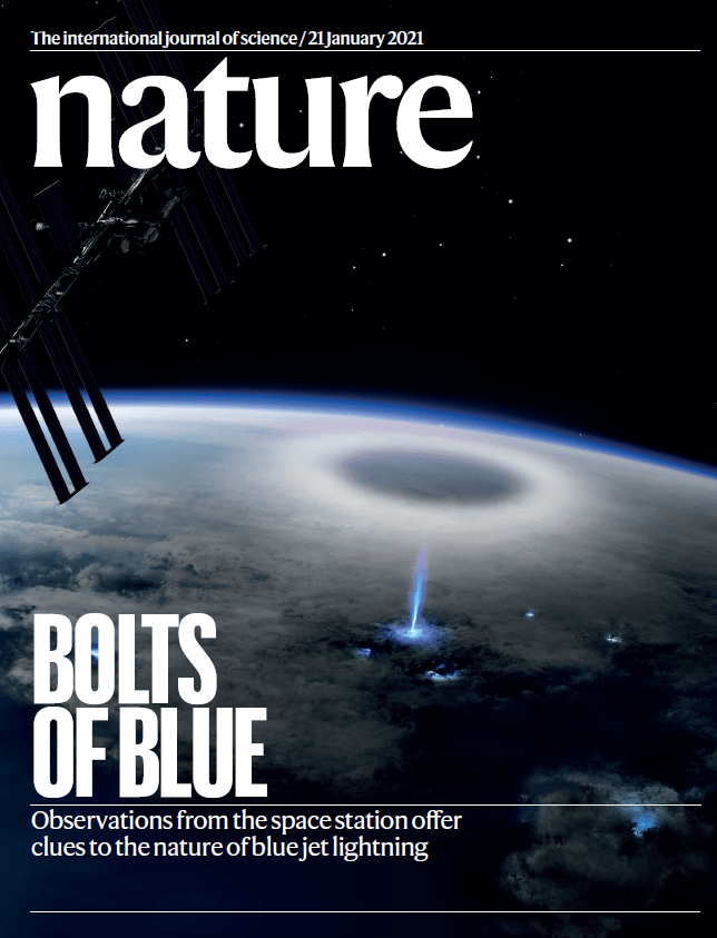 One year later, history (almost) repeated itself! On January 20th, 2021, the paper (Neubert et al., 2021) on the observations of a blue jet by the ASIM instrument, was promoted on the cover page of Nature. Blue jets are lightning-like electric discharges that shoot out of the cloud top and can reach altitudes of ~50 km and last for hundreds of milliseconds. They are most prominently seen in the blue part of the spectrum, therefore their name. In the new Nature paper entitled “Observation of the onset of a blue jet into the stratoshere”, five intense 10-microsecond blue flashes from a thunderstorm cell had been explored, giving new insight into the mechanisms that lead to production of blue jets. The study was led by Torsten Neubert and his group at Denmark Technical University (DTU) with the leader of BCSS, Nikolai Østgaard as co-author.