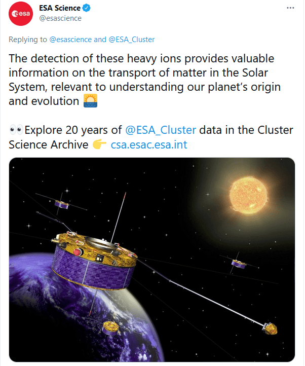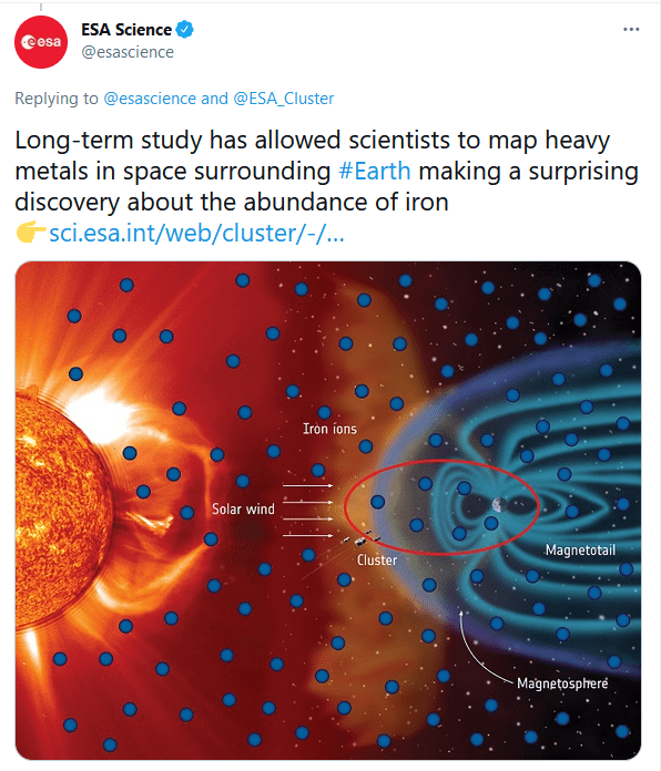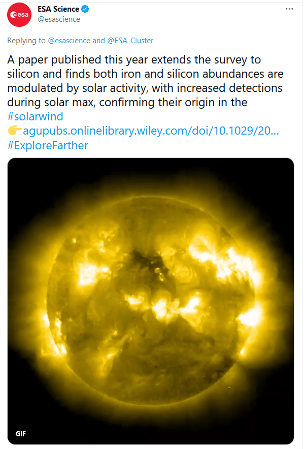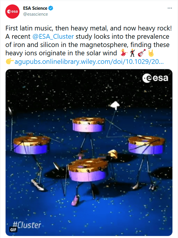 “First latin music, then heavy metal, and now heavy rock! A recent @ESA_Cluster study looks into the prevalence of iron and silicon in the magnetosphere, finding these heavy ions originate in the solar wind. The four @ESA_Cluster spacecraft, named Rumba, Samba, Salsa & Tango, have been studying Earth’s magnetic environment and its interaction with the #solarwind in three dimensions for more than 20 years. Long-term study has allowed scientists to map heavy metals in space surrounding #Earth making a surprising discovery about the abundance of iron. A paper published this year extends the survey to silicon and finds both iron and silicon abundances are modulated by solar activity, with increased detections during solar max, confirming their origin in the #solarwind. The detection of these heavy ions provides valuable information on the transport of matter in the Solar System, relevant to understanding our planet’s origin and evolution“.