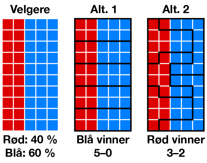 I 36 av USAs 50 stater er det de folkevalgte politikerne som tegner opp valgdistriktene, noe som fører til at man kan manipulere valg slik at mindretallet faktisk vinner flest representanter. Figuren under har jeg hentet fra denne VG-artikkelen, og den viser en tenkt delstat som skal deles opp i fem distrikter med like mange innbyggere i hver. I utgangspunktet er situasjonen den at røde velgere utgjør 40 %, mens blå velgere utgjør 60 %. Sånn sett skulle man tenke seg at det riktige ville bli 2 røde representanter og 3 blå. Men som alternativ 1 og 2 i figuren demonstrerer, kan man tegne opp valgdistriktene sånn at blå enten vinner 5 representanter, eller det blir 3-2 seier til rød. Dette til tross for at den virkelige situasjonen tilsier 3-2 seier til blå.