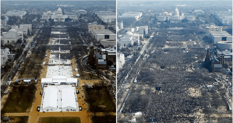 Her har vi så et videoklipp fra 21. januar 2017, hvor daværende President Trump sin pressetalsmann Sean Spicer, sier noe som verken bildet over eller virkeligheten (slik alle dengang opplevde den) kan forklare: