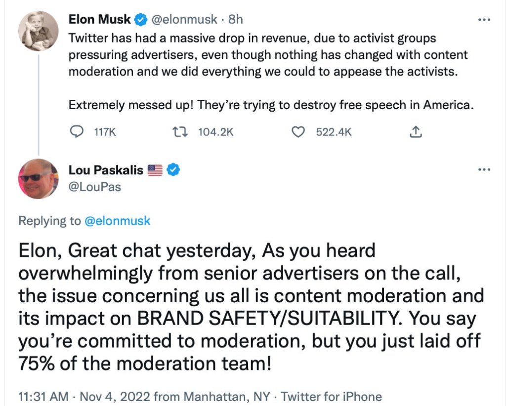 Spørsmålet er uansett hva Musk planlegger å bruke Twitter til. Selv har han lenge hevdet at målet er å sikre ytringsfriheten, men kritikere mistenker at virkeligheten egentlig handler om gi folk en plattform hvor de kan øse ut all sin rasisme og sexisme. Denne mistanken er blitt ytterligere forsterket den siste uken, etter at Musk har sparket flere 1000 Twitter-ansatte med ansvar for å moderere innhold. Følgelig har en rekke annonsører begynt å trekke seg ut fra det populære nettstedet, fordi de ikke ønsker å bli assosiert med det de frykter Twitter kommer til å utvikle seg til å bli.