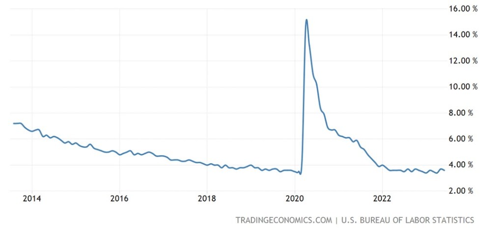 Nedenfor vises arbeidsløshetstallene siste 10 år, og vi ser at de høye ledighetstallene som rammet USA under korona-pandemien nå er tilbake til det som er historisk lave verdier.