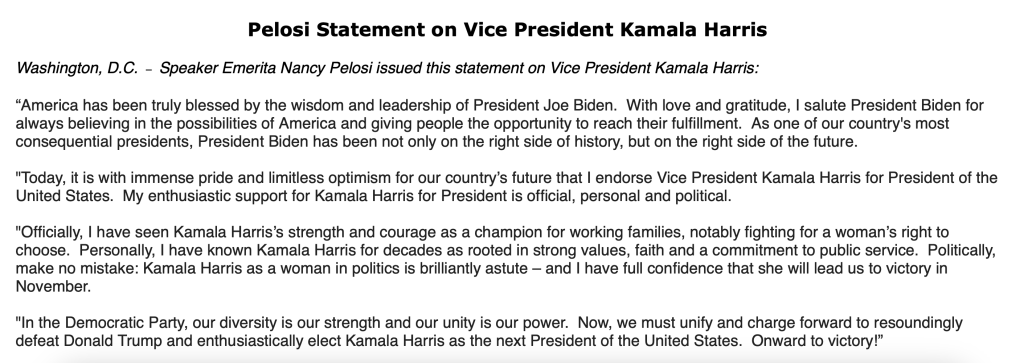 Nå bør det nevnes at Kamala Harris ennå ikke formelt sett er demokratenes Presidentkandidat. Det vil hun senest bli om 4 uker, når demkratene har sitt landsmøte. Men alt tilsier at Harris vinner frem, da de største utfordrerne som Califonia-guvernør Gavin Newsom, Pennsylvania-guvernør Josh Shapiro, Michigan-guvernør Gretchen Whitmer og Samferdelsminister Pete Buttigieg alle har gitt sin støtte til Harris det siste døgnet. Ikveld inkluderer denne støtten også tidligere Speaker i Representantenes hus, Nancy Pelosi, så kampen synes i praksis å være avgjort.
