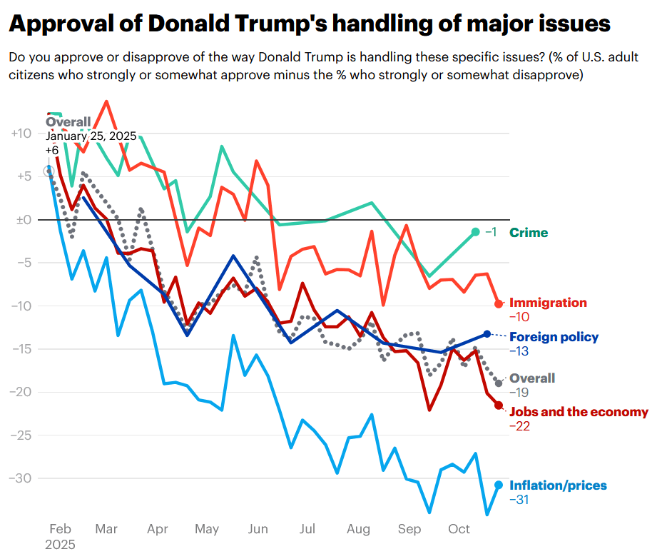 I dette blogginnlegget har jeg vist hvordan en rekke pågående saker i amerikansk politikk (Epstein-saken, tap av helseforsikring, mulige krigsforbrytelser og H-1B trøbbel) er i ferd med å gjøre stor skade på President Trump og hans politiske verk. Og da har jeg ikke engang nevnt alle problemene knyttet til økende matvarepriser og ikke minst de forferdelige ICE-angrepene. Sistnevnte gjør at en rekke minoritetsgrupper angrer sin tidligere Trump-støtte og nå heier på demokratene.