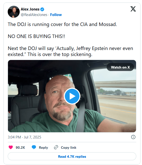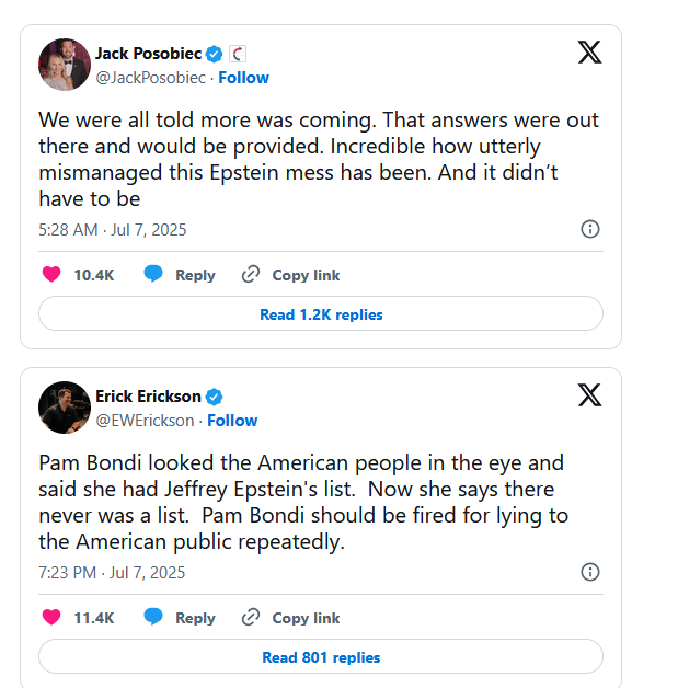 Et halvt år ut i Trumps nye Presidentperiode publiserer plutselig Justisdepartementet en svært overraskende pressemelding for MAGA-bevegelsen. Det hevdes at Epstein aldri førte noen klientliste over de som misbrukte unge jenter, og at saken nå lukkes for godt. Dette førte til sterke reaksjoner fra MAGA-bevegelsen: