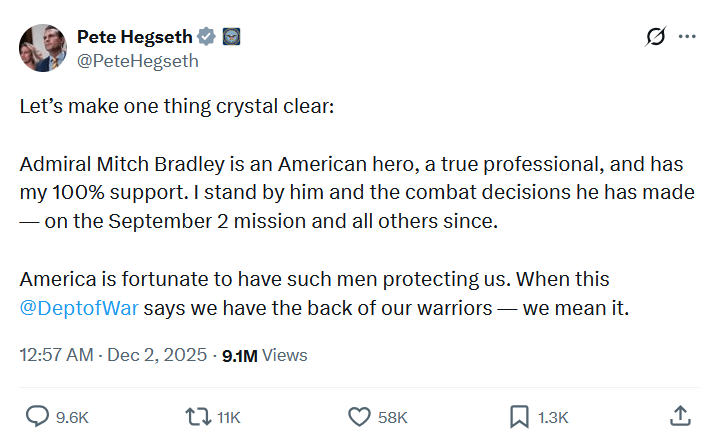 I slutten av november økte kritikken kraftig i styrke da Washington Post den 28.11 skrev at forsvarsminister Pete Hegseth hadde gitt verbal ordre om å “kill everybody” da et første angrep hadde resultert i en sønderknust båt og to menn som klamret seg desperat til vrakrestene. Til å begynne med nektet både Hegseth og Trump for påstandene i avisen og mente det hele var snakk om såkalt Fake News. Men da de erkjente at både House Armed Services Committee og Senate Committee on Armed Services har iverksatt undersøkelser, endret historien seg og Hegseth begynte plutselig å tvitre om en admiral som skal ha vært involvert: