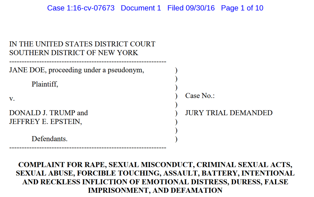 I forkant av Presidentvalget i 2016 mellom Donald Trump og Hillary Clinton, verserte det rettsdokumenter i media om voldtektsanklager mot både Trump og Epstein.