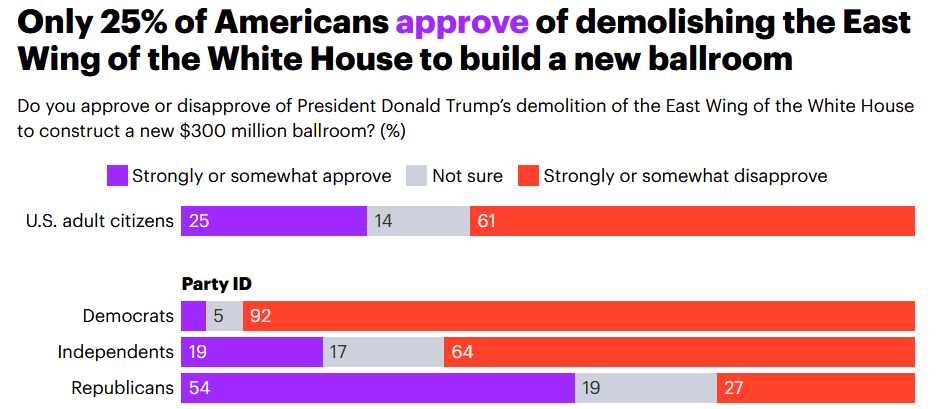 Denne høsten har President Trump rasert den historiske østfløyen i det Hvite hus for å bygge et nytt ballrom, og heller ikke dette tiltaket skaper stor entusiasme blant folk flest:
